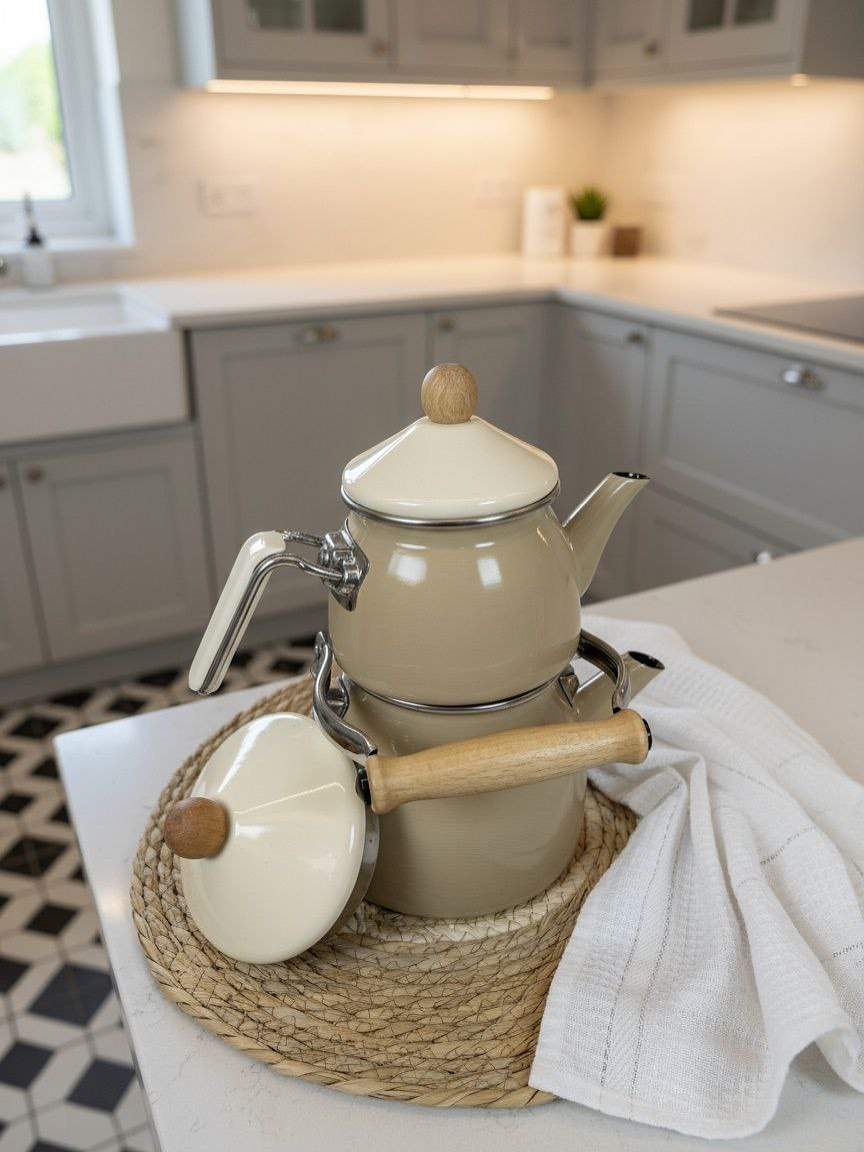 کتری و قوری با جنس لعابی سه لایه و درب جداگانه. وزارت شبکه اجتماعی را به صورت درب چوبی و استیل با رنگ ثابت ارائه میدهد.