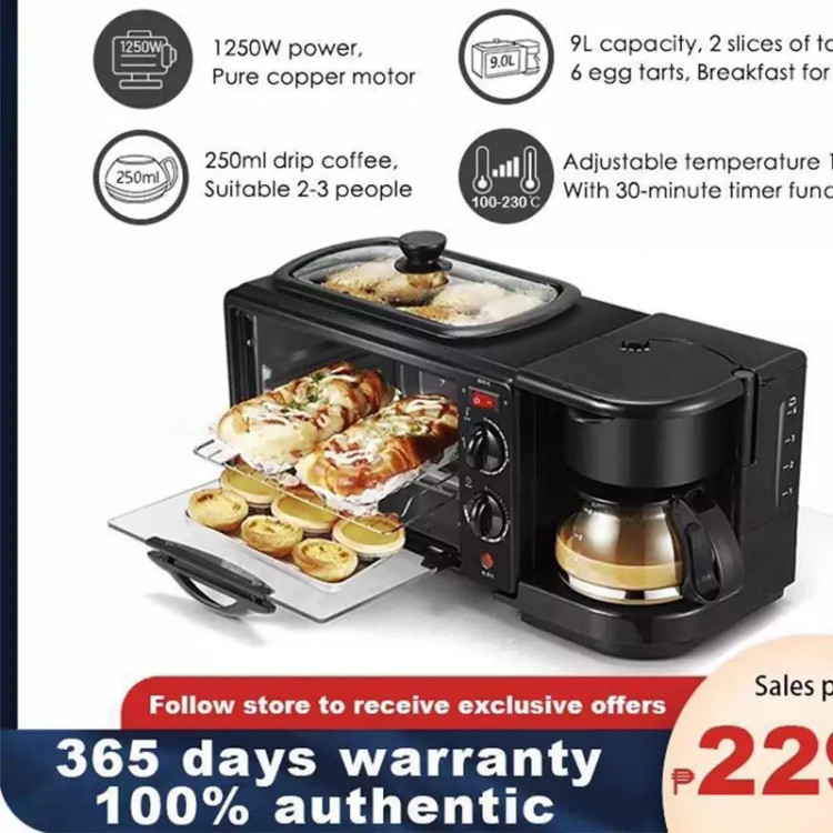 دستگاه صبحانه ساز سه کاره محصول وارداتی با کیفیت عالی برندmelika مناسب برای پخت مینی پیتزا،پخت شیرینی،روست چیکن،پخت کیک،گریل گوشت… دارای قهوه ساز و چای ساز تا 6 استکان دارای فر برقی برای توست نان و پخت انواع کیک(ظرفیت 7 لیتر) دارای گریل با درب شیشه ای برای پخت انواع نیم رو ،کباب و... حداکثر توان:1050وات طول:44ارتفاع:21عرض:18