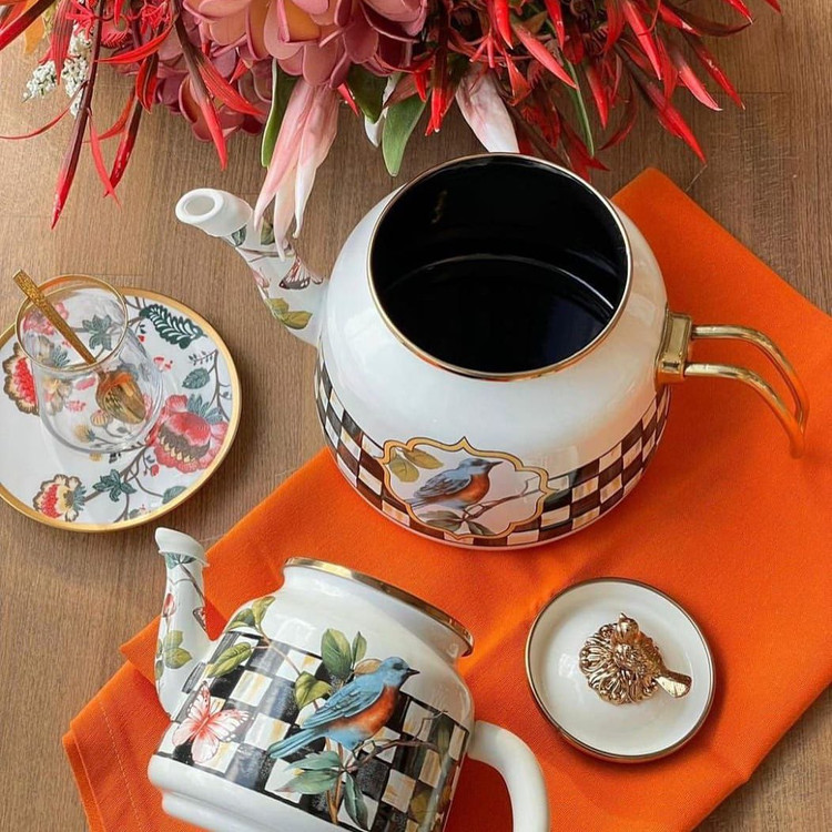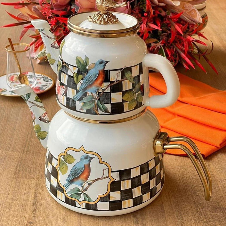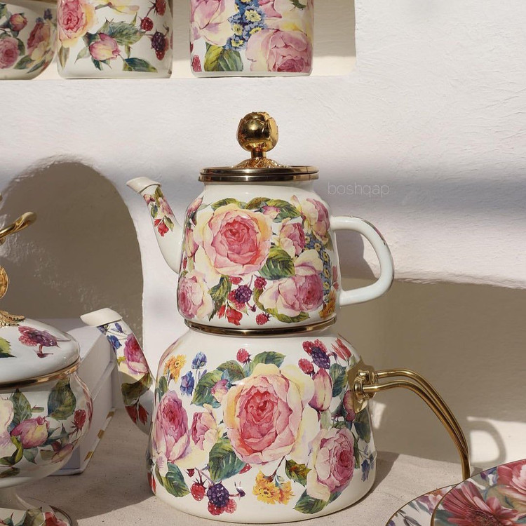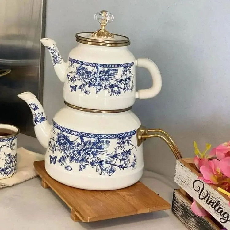 شارژ چندین باره کتری و قوری لعابی برند Miss Betty ترکیه جنس لعاب با کیفیت عالی و رنگ ثابت در ۵ طرح مختلف قلم آبی، گنجشک، لیمو، رز و طوطی. دسته ها در اثر حرارت داغ نمیشود.