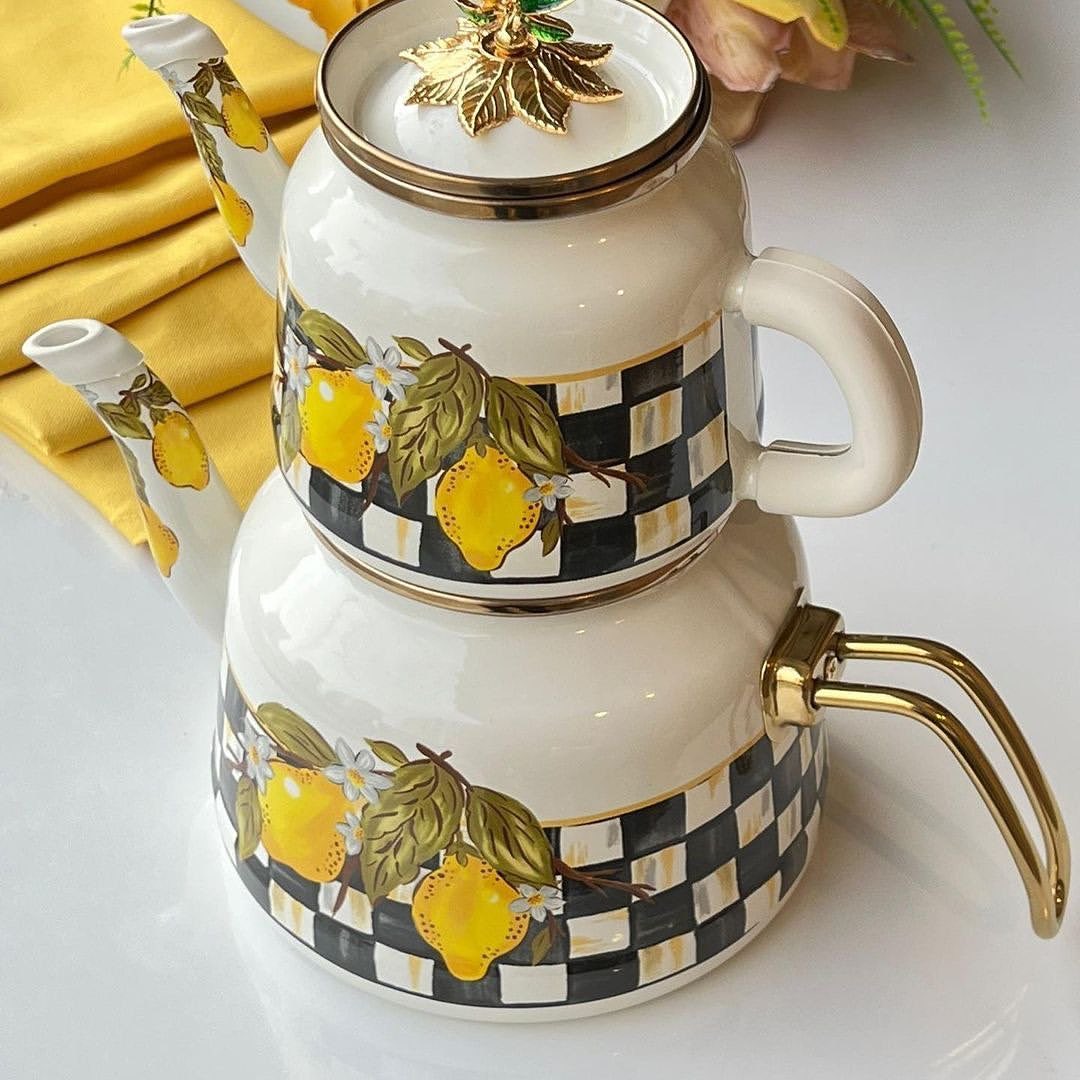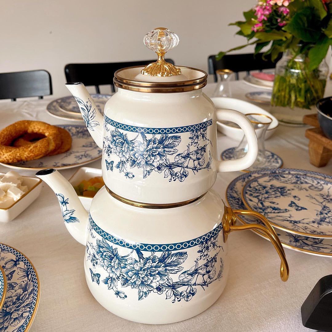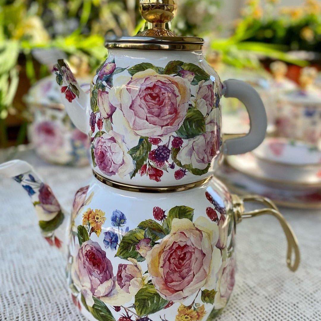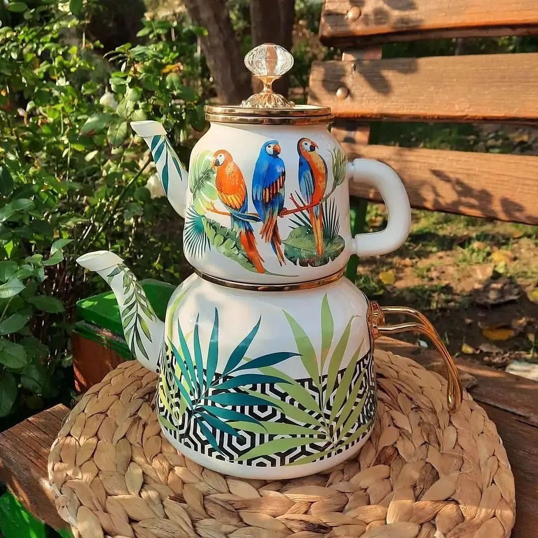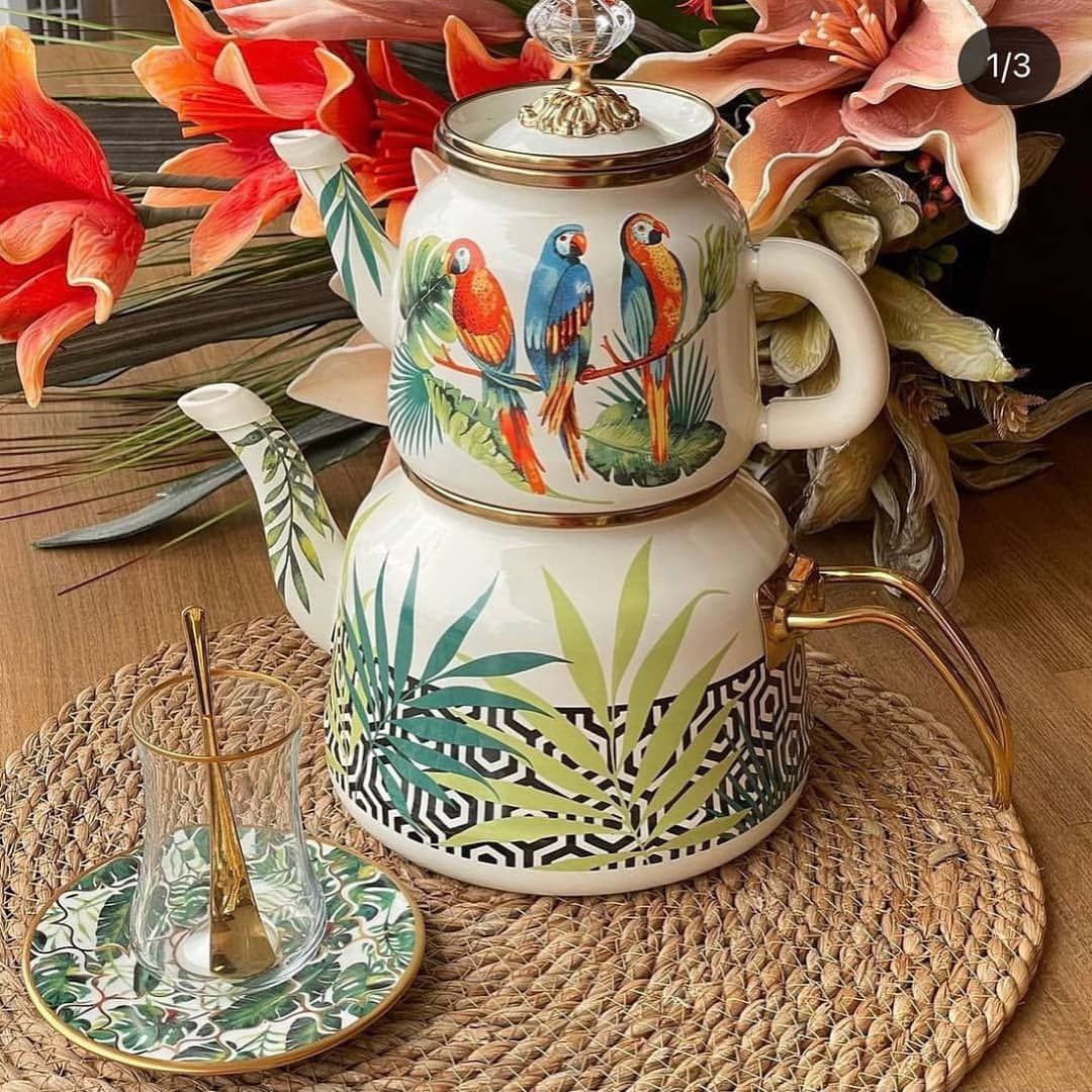 شارژ چندین باره کتری و قوری لعابی برند Miss Betty ترکیه جنس لعاب با کیفیت عالی و رنگ ثابت در ۵ طرح مختلف قلم آبی، گنجشک، لیمو، رز و طوطی. دسته ها در اثر حرارت داغ نمیشود.