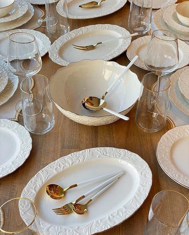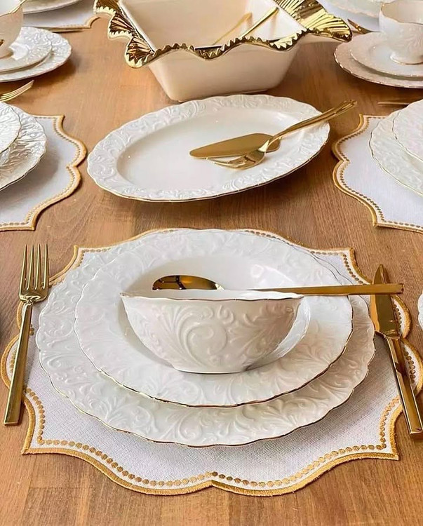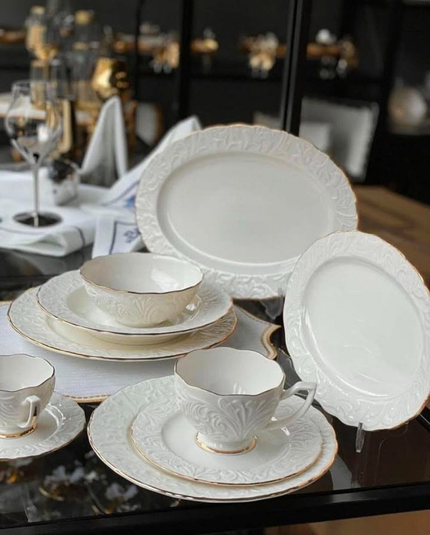 کیفیت عالی و رنگ ثابت لبه طلاکوب شده جنس چینی بن چاینا قابل استفاده در فر و ماشین ظرفشویی. سرویس ۲۶ پارچه : ۶عدد بشقاب پلو، ۶عدد پیش دستی، ۶عدد خورشت خوری، ۶عدد پیاله، ۲ عدد دیس پلو.