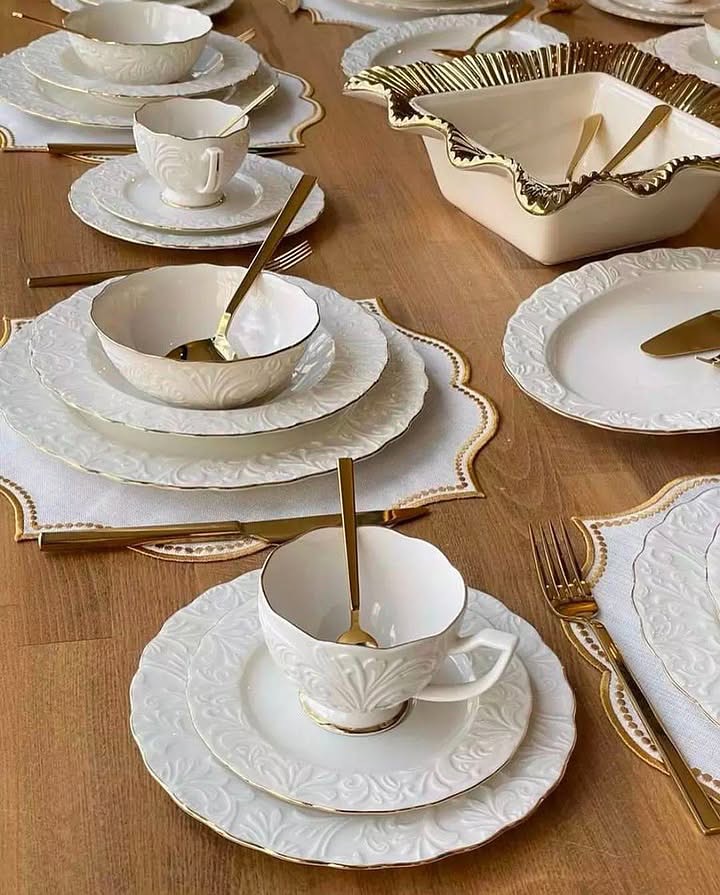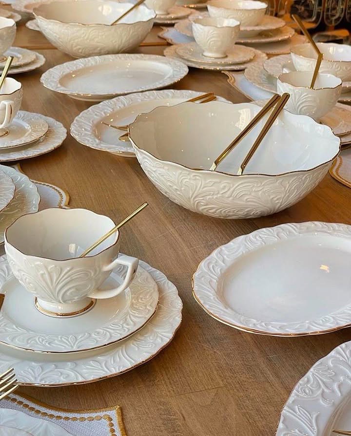 کیفیت عالی و رنگ ثابت لبه طلاکوب شده جنس چینی بن چاینا قابل استفاده در فر و ماشین ظرفشویی. سرویس ۲۶ پارچه : ۶عدد بشقاب پلو، ۶عدد پیش دستی، ۶عدد خورشت خوری، ۶عدد پیاله، ۲ عدد دیس پلو.